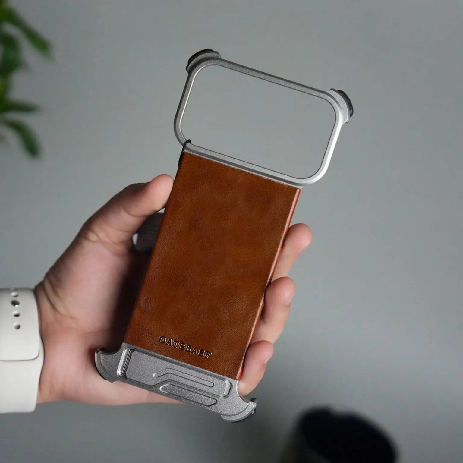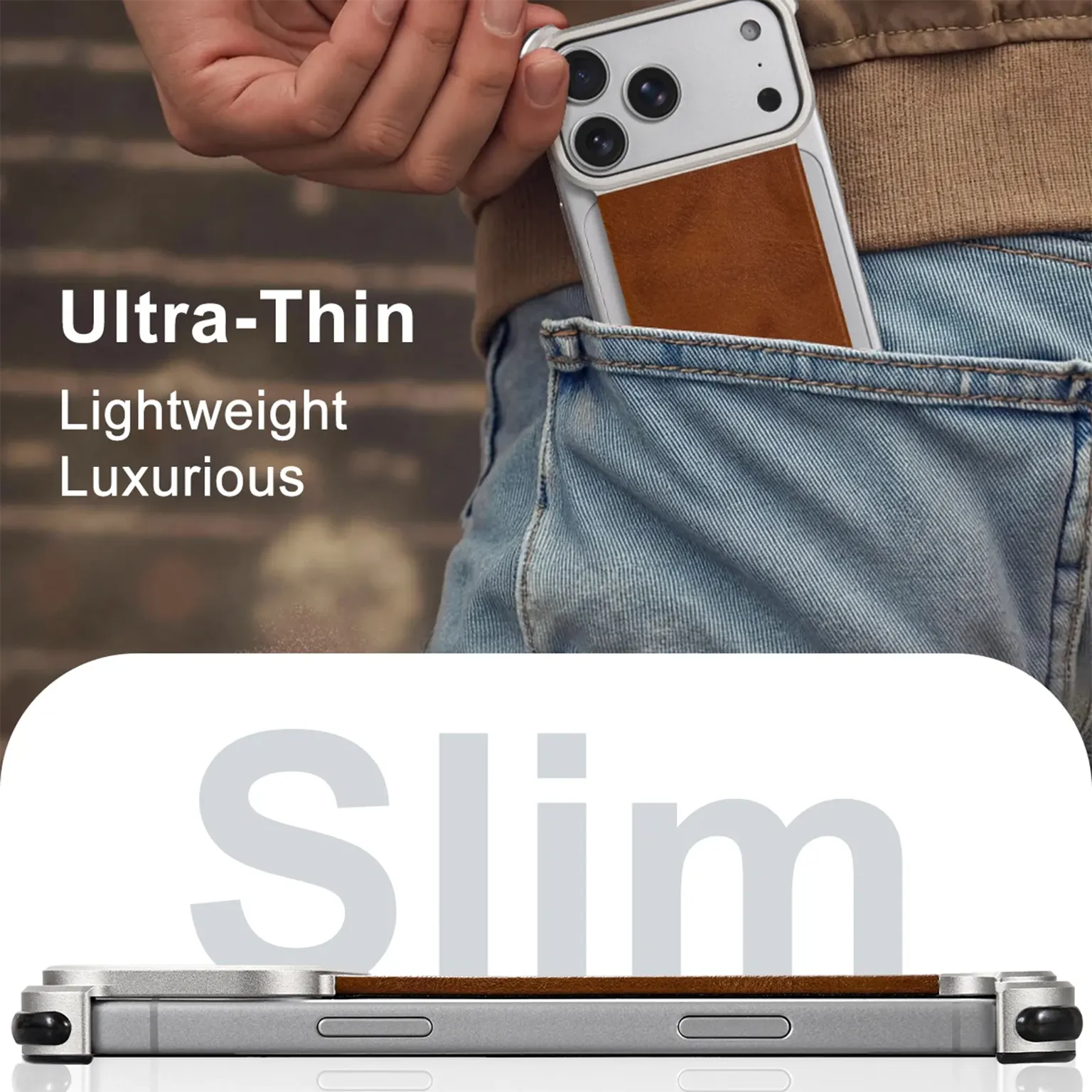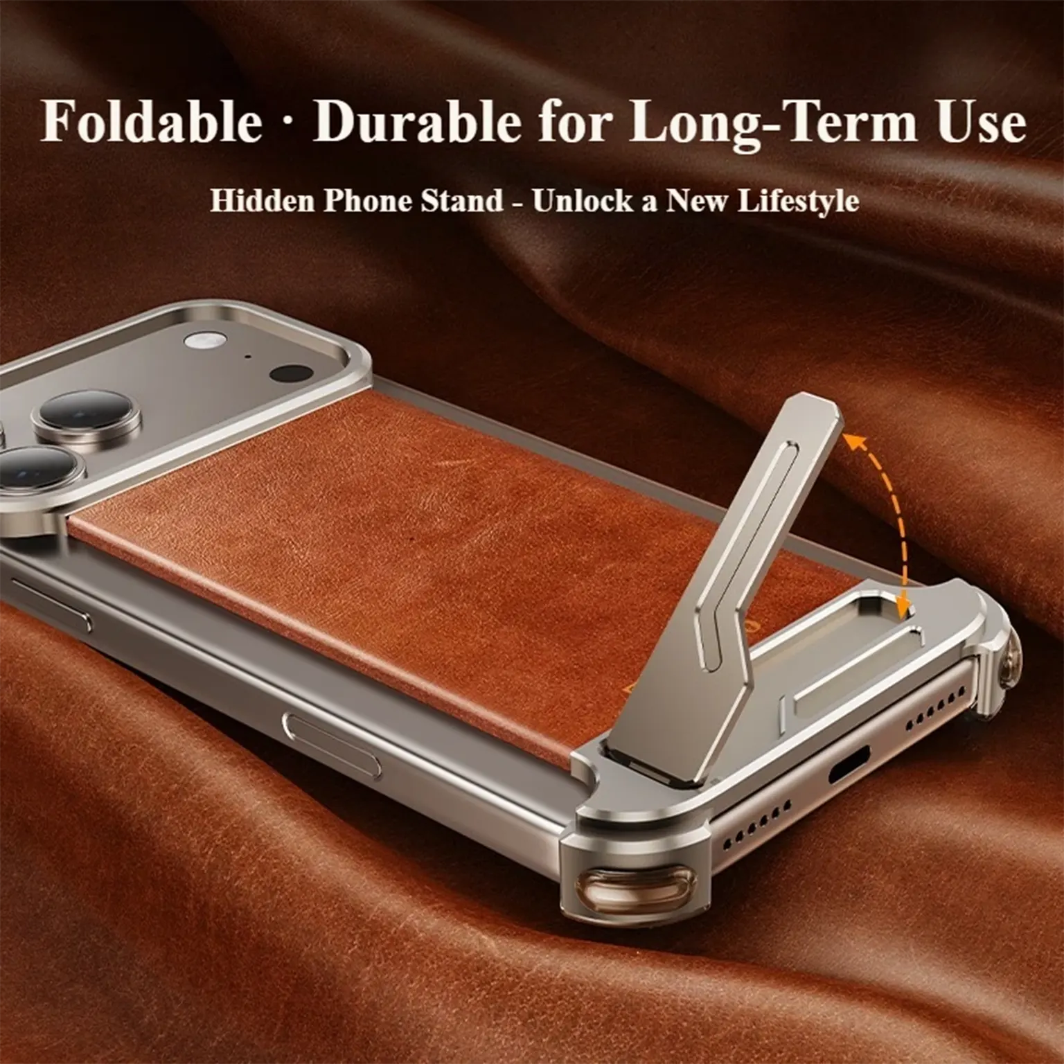 OATSBASF Magnetic Leather Metal Hidden Kickstand Frameless Magsafe Case for iPhone 17 Pro