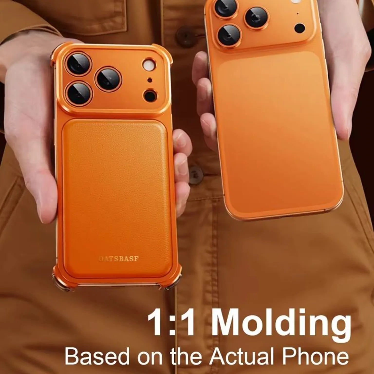 This iPhone 17 Pro case fuses industrial strength with refined aesthetics through premium PU leather and metal construction. Metal borders paired with impact-resistant cushioning deliver military-grade protection, while the slim hard back maintains a refined silhouette. The frameless design ensures a comfortable, ergonomic grip without unnecessary bulk. An integrated magnetic kickstand with Halbach technology enables stable, multi-angle viewing and supports faster wireless charging. The luxurious leather exterior resists scratches and daily wear, creating a sophisticated protective solution that balances durability with elegance.